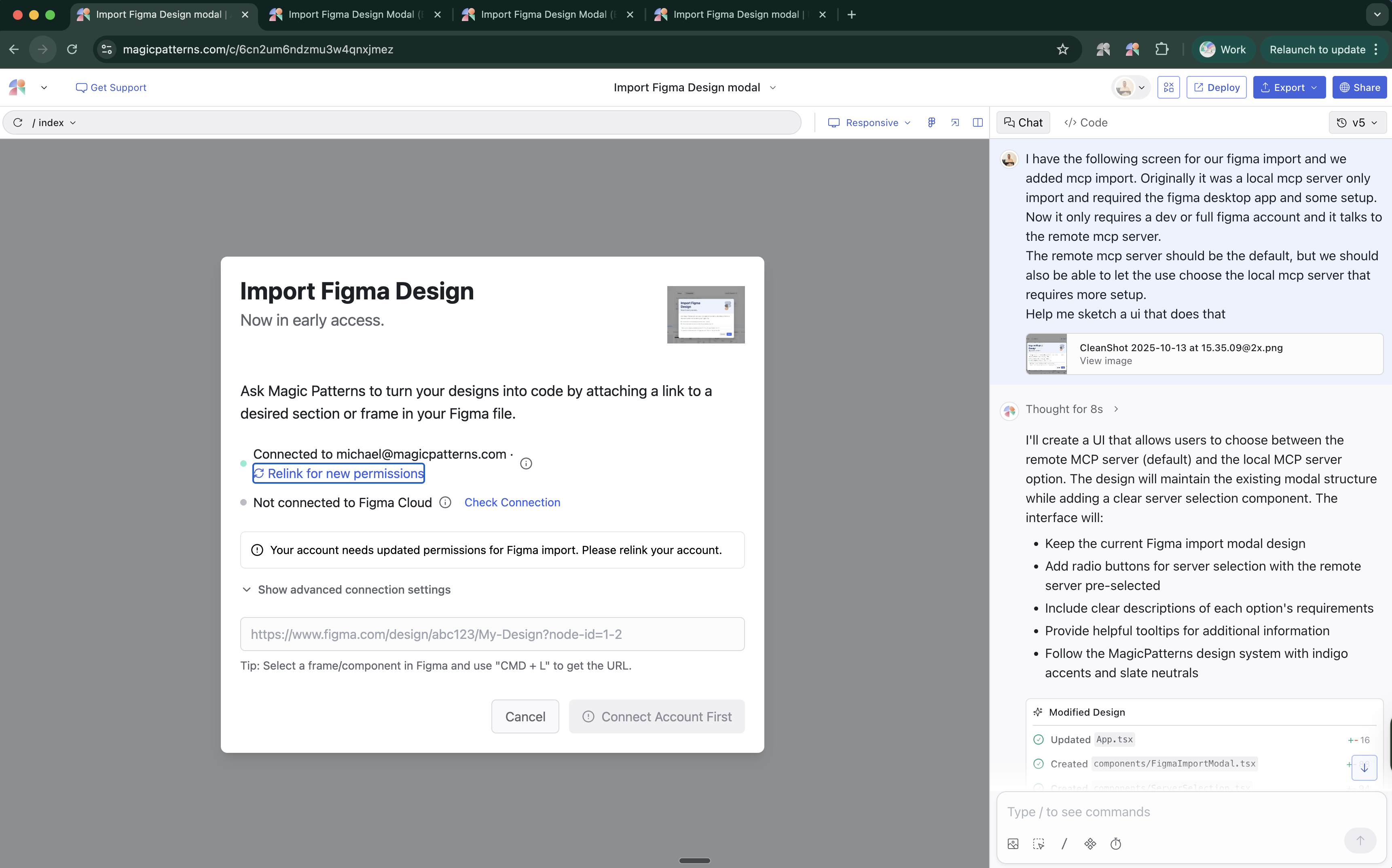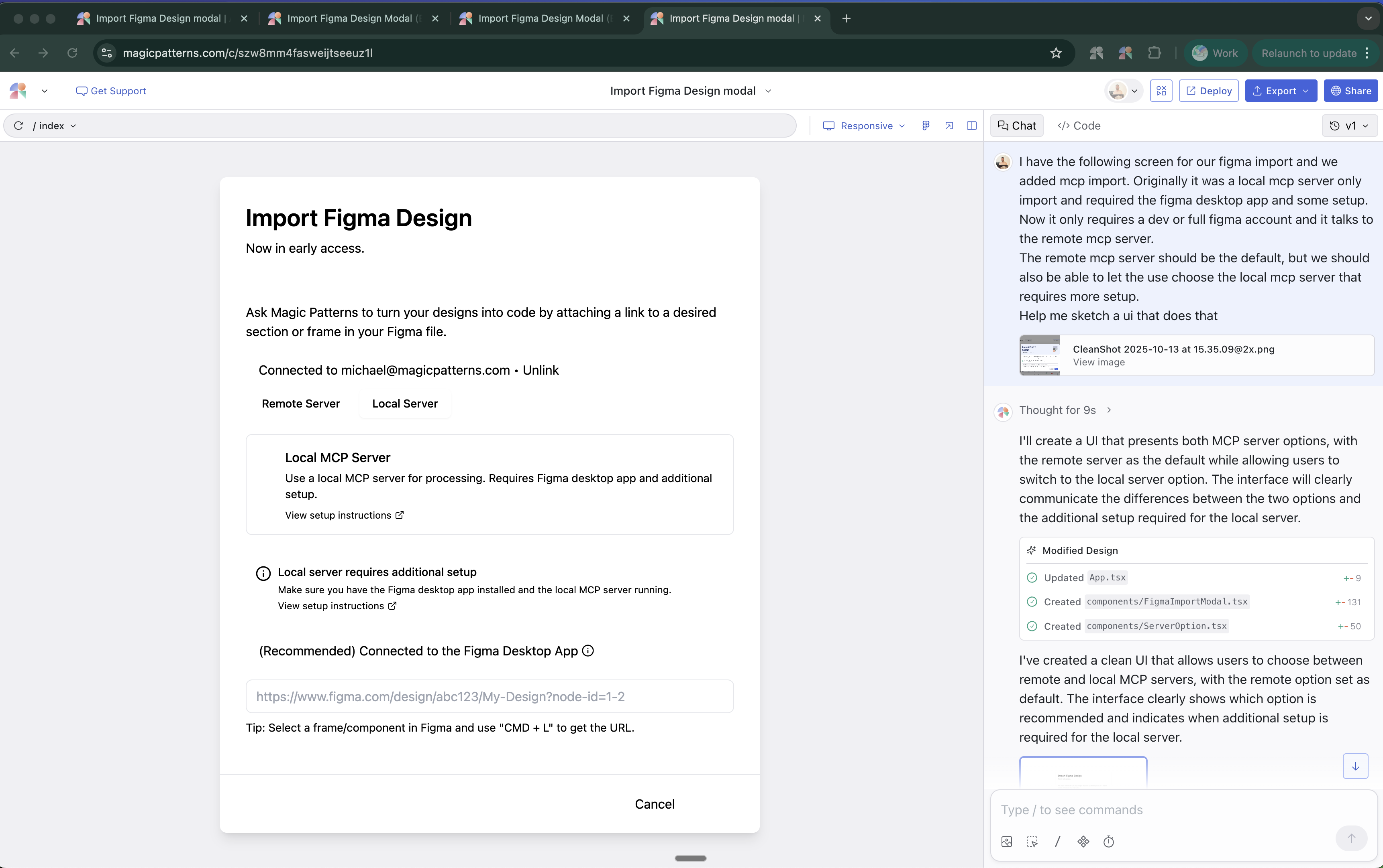 After we got the new way to work in our app, and after early testing, the only disadvantage to remote mcp was timeouts on large component imports. But that seemed like an edge case for advanced users. So now was the time to think about the user interface.